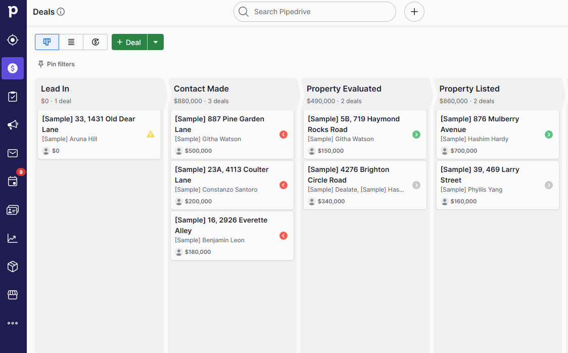 Pipedrive provides a clear, pipeline-centric set of tools tailored for sales-driven workflows, positioning it as a reliable CRM for real estate professionals. Its intuitive design simplifies deal tracking, making it a notable contender in real estate CRM platforms. Here’s what Pipedrive includes: