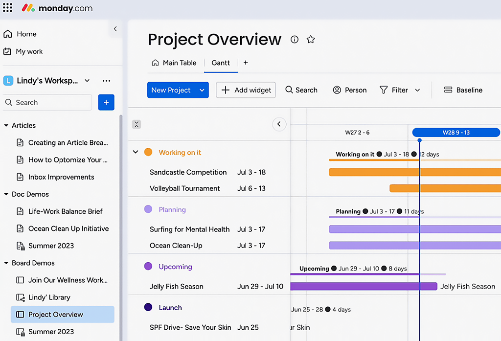 Pro tip: Set up Monday’s automation features to automatically move tasks to “In Progress” when their predecessors are complete. This reduces manual project management overhead.