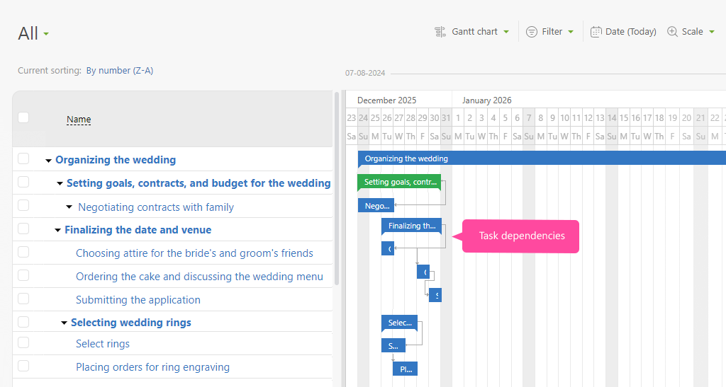 - Enable the Gantt chart view to visualize all your dependencies.