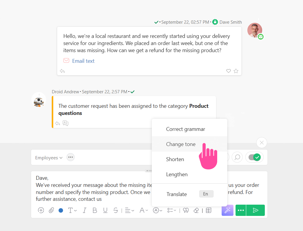 - Automatic detection and translation of incoming customer messages.