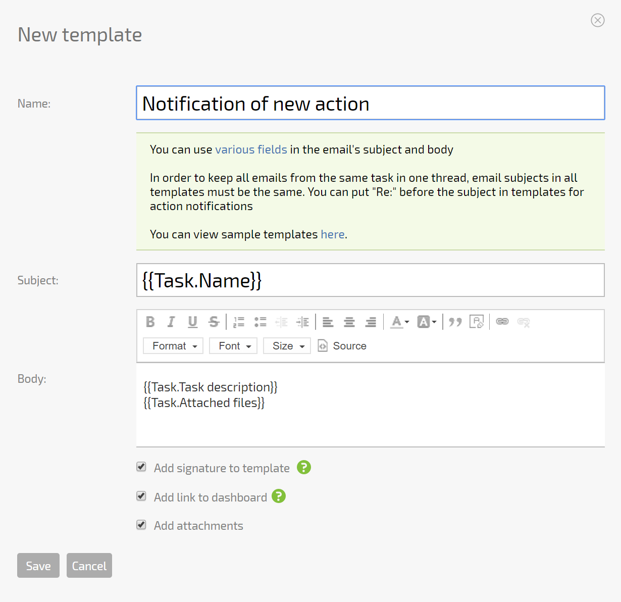 Planfix has tools for outbound email as well: you can set up templates, include automatic signatures, or include additional information from task fields. You can use different templates in different situations. For example, an automatic response to a client request can contain key parameters from the request, and any further communication from your coworkers can take place through emails that, from the client's perspective, will be no different from regular emails.