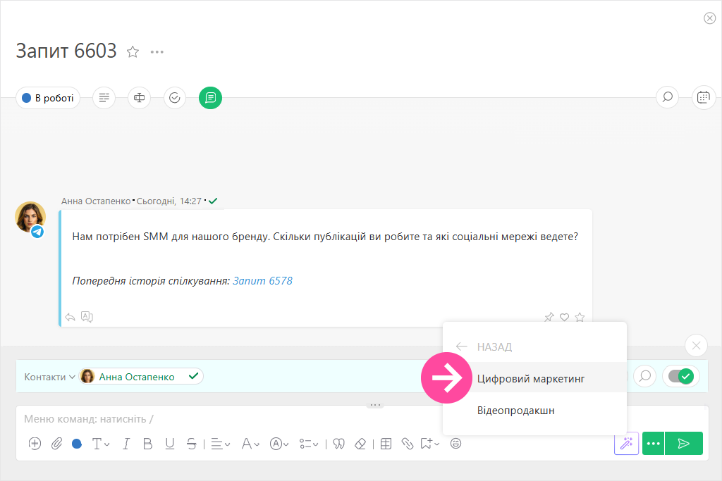 Planfix AI робить первинний контакт із клієнтом швидким, точним і впевненим. Замість того щоб витрачати хвилини на пошук документів і звірку умов, менеджер отримує готову підказку в один клік і може одразу відповісти на запит клієнта.