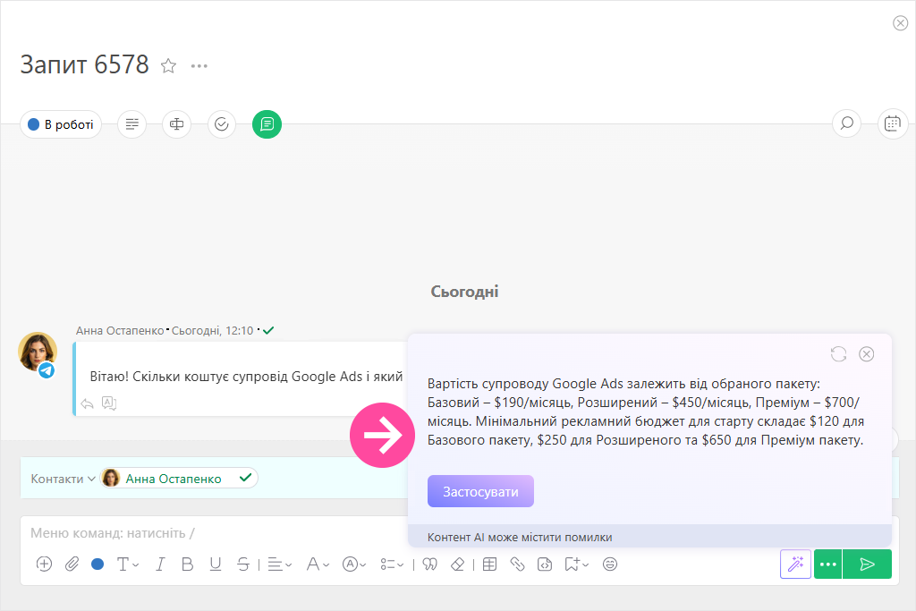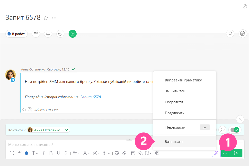 Підказку від AI завжди можна відредагувати перед відправленням – повідомлення надсилається клієнту від імені співробітника.