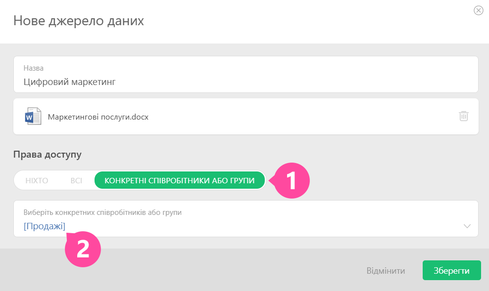 Якщо в систему завантажено кілька розділів бази, менеджер може вибрати, де саме AI шукатиме інформацію.
