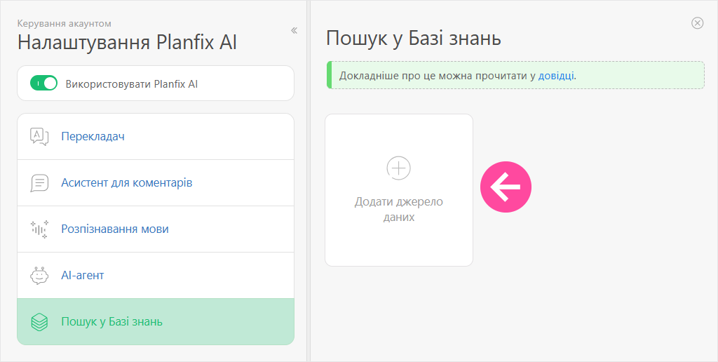 Перейдіть у «Керування акаунтом», відкрийте налаштування Planfix AI та перейдіть до розділу «Пошук у базі знань». Зберіть інструкції, каталоги та регламенти в окремий документ і завантажте його в Planfix.