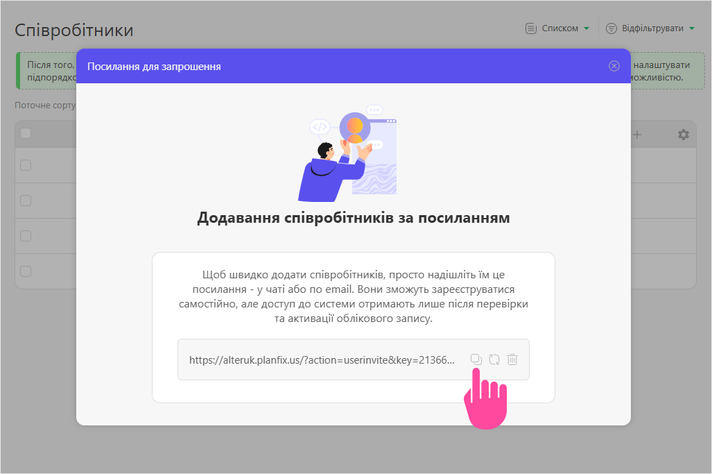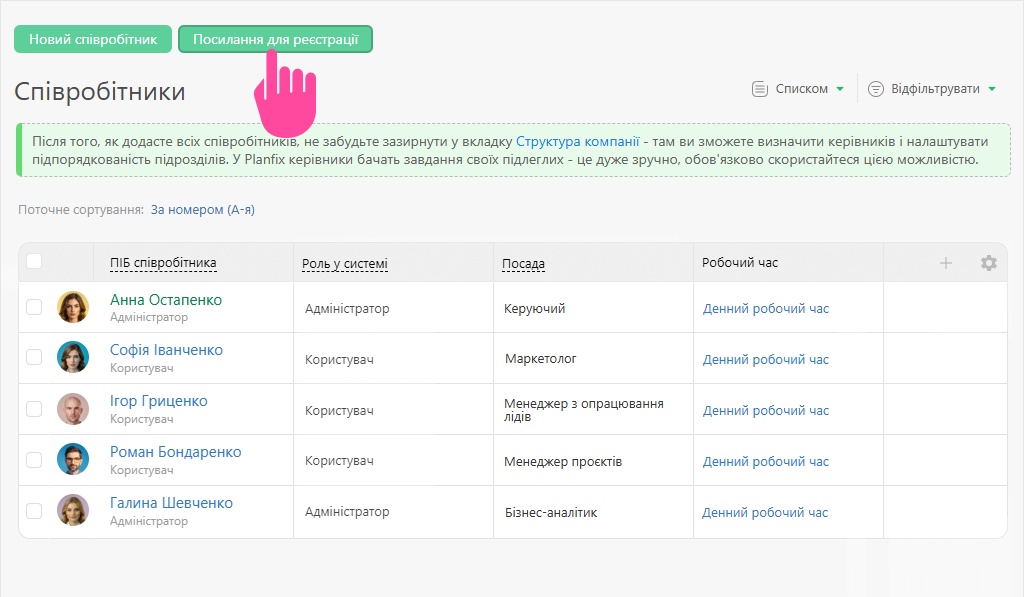 Planfix сам згенерує посилання для реєстрації співробітників, вам залишиться лише скопіювати його: