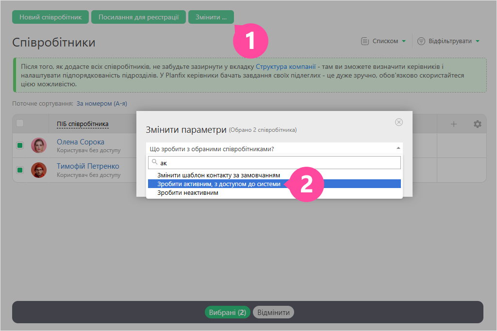 Виділяємо потрібних і, використовуючи масові дії, відкриваємо їм доступ до акаунту компанії: