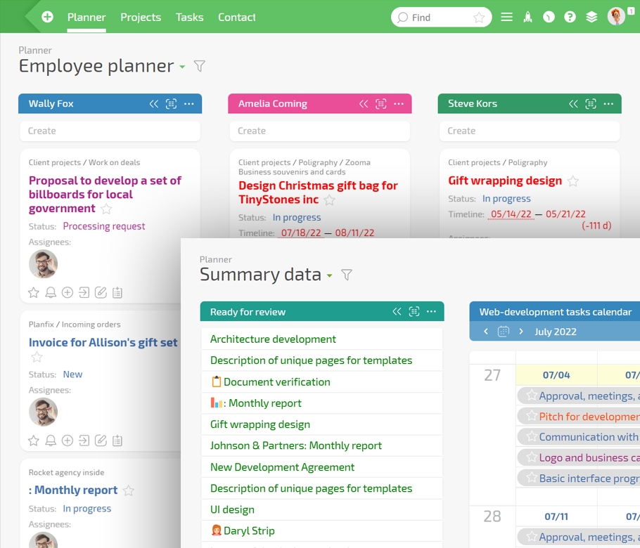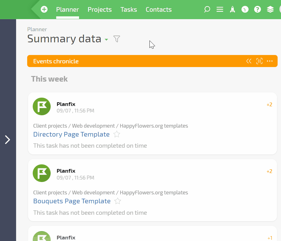 All tasks in Planfix can be displayed in one place, in the Planner. Task statuses and their corresponding colors make it easy to track how work is progressing.